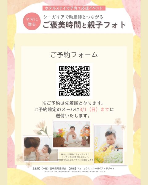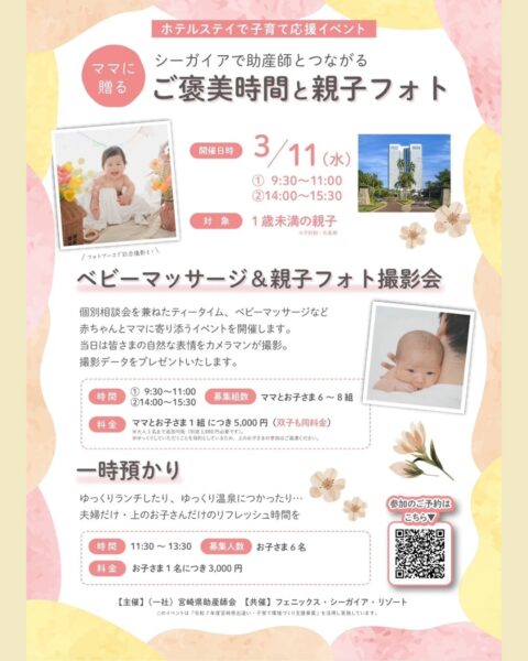 (一社)宮崎県助産師会では、フェニックス・シーガイア・リゾート様と協働し、ホテルステイ型産後ケアを実施いたします。